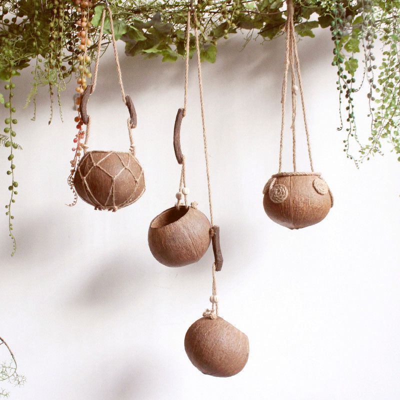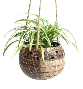 Eco-friendly hanging planter handcrafted from natural coconut shell – durable, stylish, and perfect for adding greenery to balconies, windows, or indoor spaces