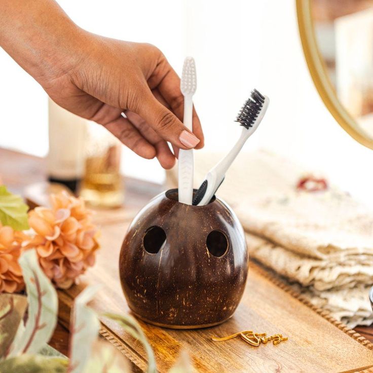 Handcrafted toothbrush holder made from natural coconut shell – eco-friendly, water-resistant, and perfect for adding a rustic, sustainable touch to your bathroom.