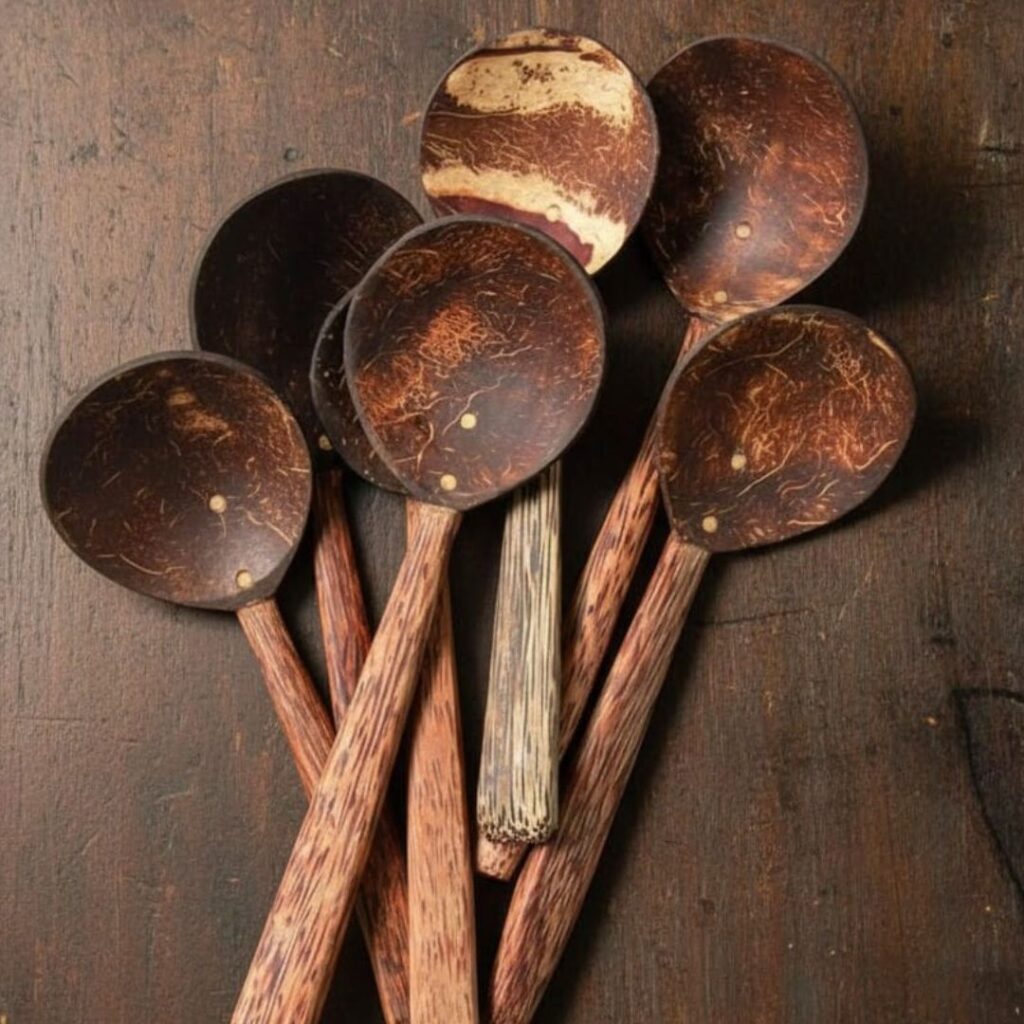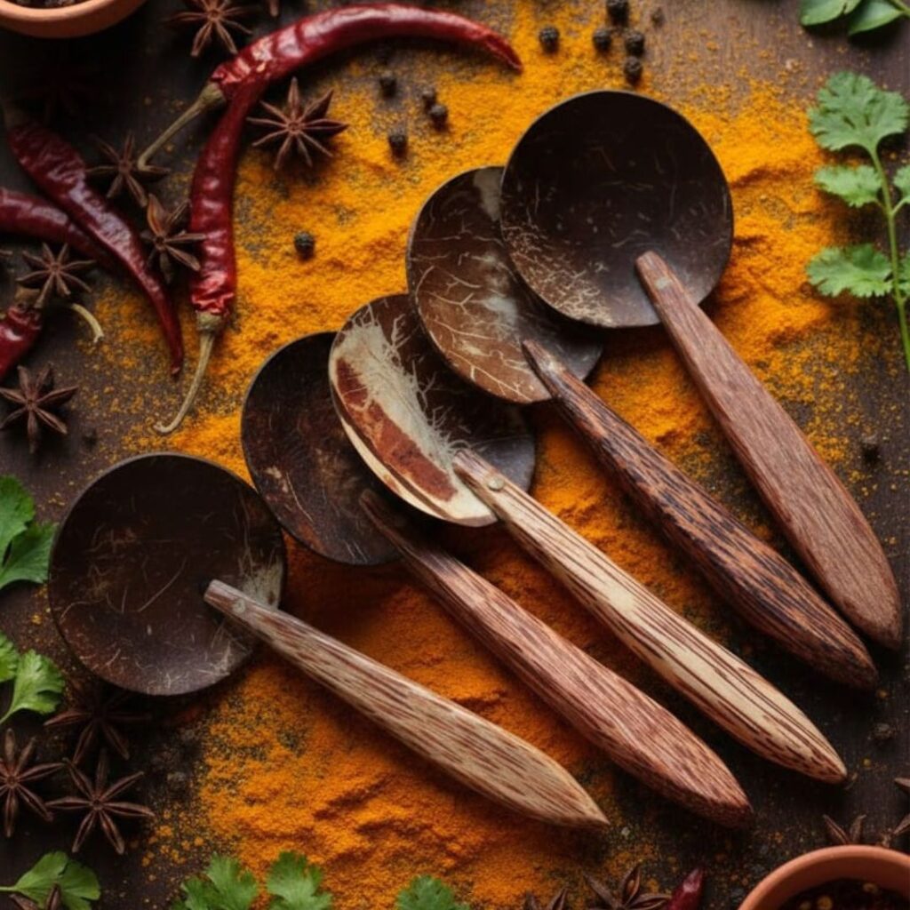 Handcrafted masala spoons made from natural coconut shells – eco-friendly, durable, and perfect for scooping and serving spices in style.